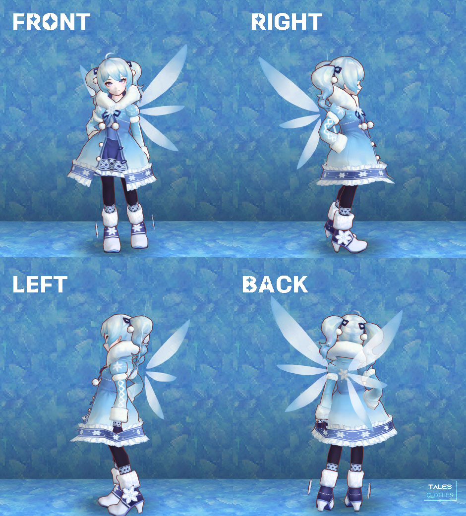 패턴으로는 눈 결정을 넣어서 겨울의 느낌이 많이 나는 복장인 거 같습니다.
